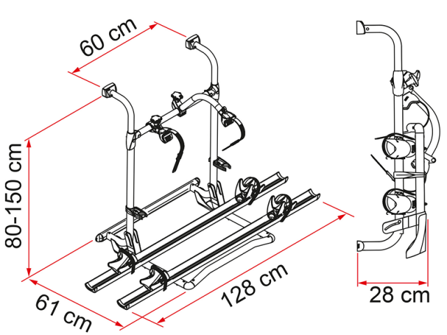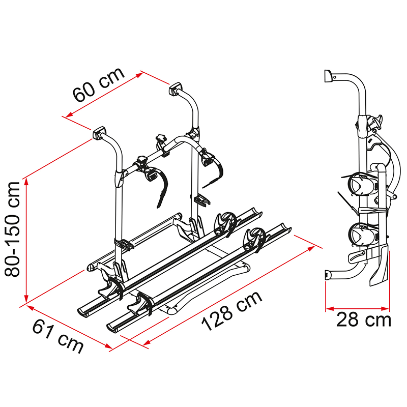 This telescopic bike carrier – leader of the Pro line – has a highly adjustable upper structure for better stability. The rounded tube structure is easily adjustable from 80 to 150cm in height to fit different installation requirements.